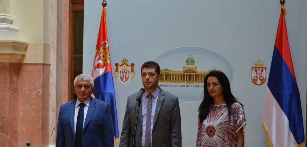 Miljan Damjanović: Poštovani novinari, želimo da vas obavestimo da poslanici Srpske radikalne stranke danas neće učestvovati u ovom posebnom sazivu parlamenta, odnosno bojkotovaće dolazak predsednika Bundestaga…