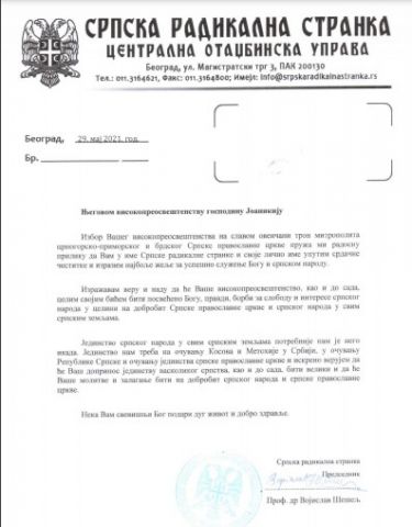 У своје име и у име Српске радикалне странке др Шешељ честитке је упутио Његовом преосвештенству и Митрополији.