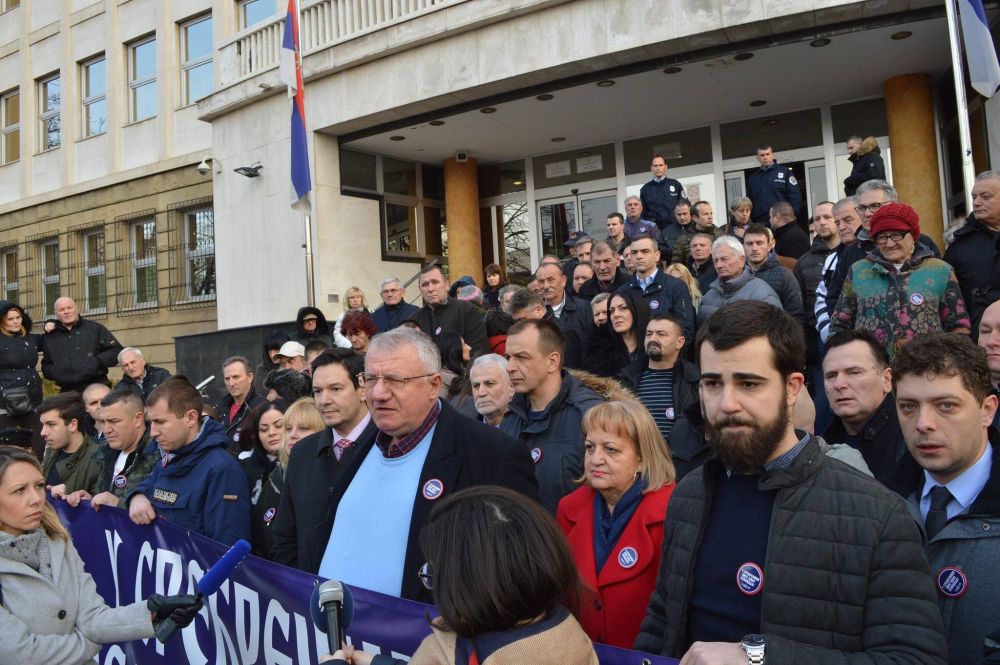 Чланови и функционери Српске радикалне странке окупили су се испред зграде Специјалног суда у Београду, како би протестовали против суђења осморици полицајаца Специјалне бригаде МУП-а Републике Српске за злочин у селу Кравица код Сребренице 1995. године.