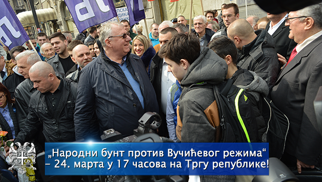 Први велики митинг биће одржан 24. марта у 17 часова у Београду, на Тргу Републике. Митинг носи назив "Народни бунт против Вучићевог режима" и представљаће протест поводом потписивања и ратификације ИПАП споразума са НАТО пактом, евоцирање успомена на жртве америчког и НАТО бомбардовања Србије 1999. године, као и протест против драконске казне коју ће Хашки трибунал тог дана изрећи Радовану Караџићу. Функционери Српске радикалне странке ће критиковати режим због катастрофалног стања у свим аспектима спољне и унутрашње политике и представиће целовит политички предизборни програм Српске радикалне странке.