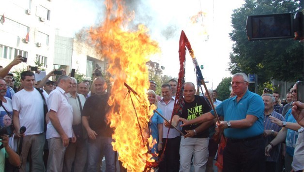 Српска радикална странка одржала је данас протестне демонстрације испред зграде Хрватске амбасаде пред већим бројем функционера и присталица. Др Војислав Шешељ запалио је xрватску усташку заставу и окупљенима рекао следеће: