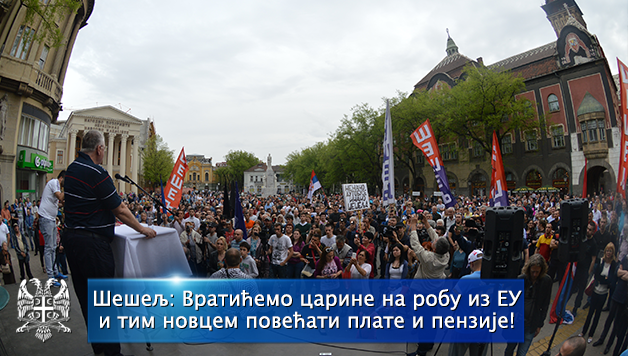 На митингу Српске радикалне странке у Суботици, председник странке проф. др Војислав Шешељ оштро је критиковао економску политику Владе Републике Србије. Шешељ је најавио да ће забранити продају српске земље странцима и објаснио да је забрана продаје земље страним држављанима најбољи и најсигурнији начин да Србија поврати контролу над својим тржиштем. Он је такође истакао да се Србија одрекла пола милијарде евра укидањем царина на робу из Европске уније и најавио повратак царина како би се тај новац искористио за повећање плата и пензија.