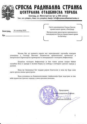 Молим Вас да примите изразе мог најискренијег саучешћа поводом упокојења у Господу Његовог блаженства архиепископа цетињског и митрополита Црногорско-приморског и скендеријског господина Амфилохија.
